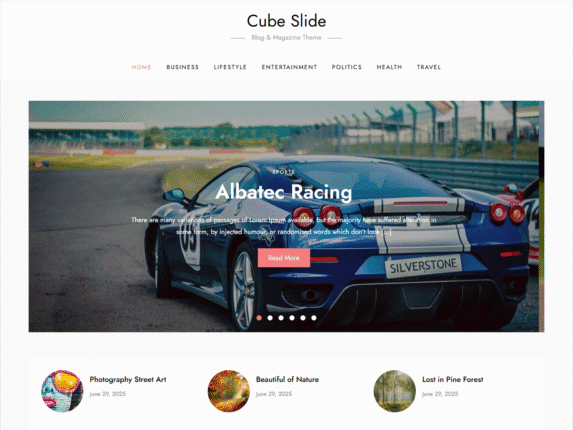 Cube Slide is a simple, clean and responsive WordPress blog theme built by Kantipur Themes. This theme is perfect for youtube bloggers, travel blog, food blog, fashion blog and writers who need to create personal blog site with simple creative features and effects to make readers feel the pleasure of reading blog posts and articles.