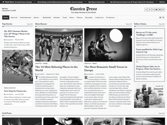 Classica Press is a stylish WordPress theme with a timeless black-and-white design, perfect for news, magazine, and portal websites. Its classic layout, clean typography, and minimalist style put your content at the center, creating a professional and elegant reading experience. Fully responsive and SEO-friendly, this theme combines performance with sophistication, making it ideal for publishers, […]